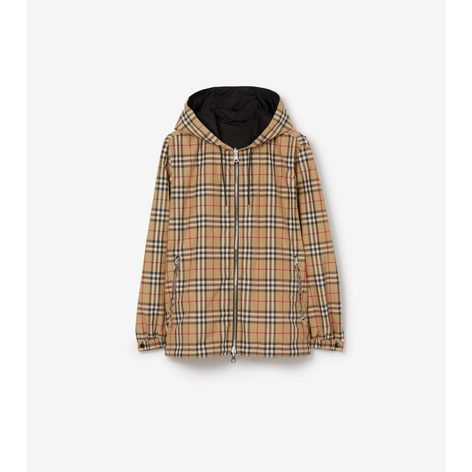 A lightweight jacket reversing from the Burberry Check to a solid colour with a logo appliqué. The hooded style is cut to a relaxed fit. Two-way zip closure Drawcord hood and hem Side zip pockets; reverse press-stud welt pockets Elasticated press-stud cuffs Silicone patch with raised Burberry lettering at chest
