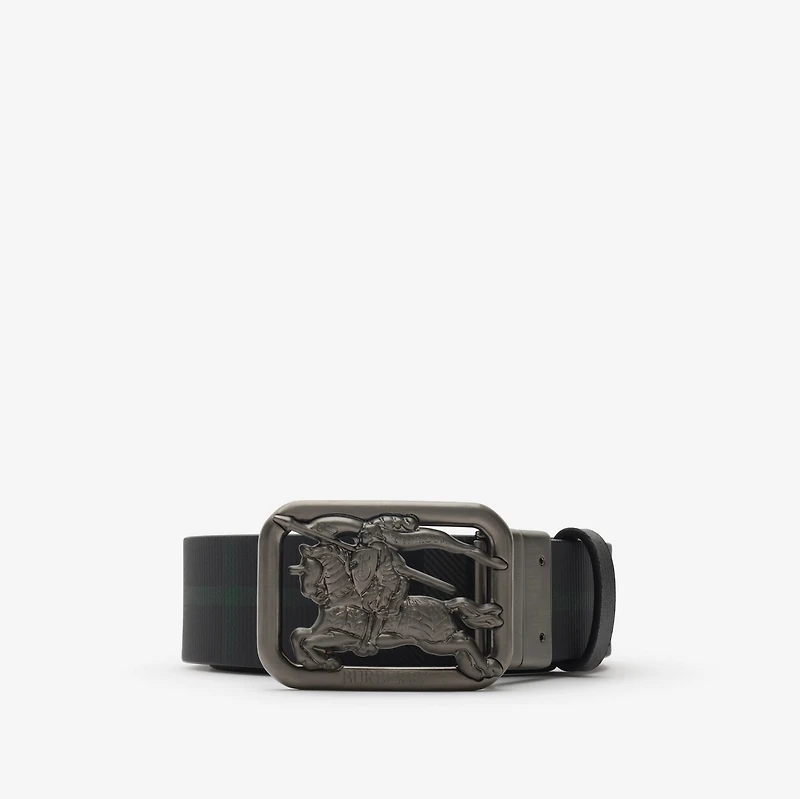 Our iconic Knight sits at the centre of the new Rider belt. Crafted in Italy from a coated cotton blend and printed with the Burberry Check in a charcoal grey colourway, the style reverses to smooth calf leather and is distinguished by a polished metal Equestrian Knight Design. Hand-painted edges Brushed metal hardware Engraved Burberry lettering at buckle Comes with a dust bag