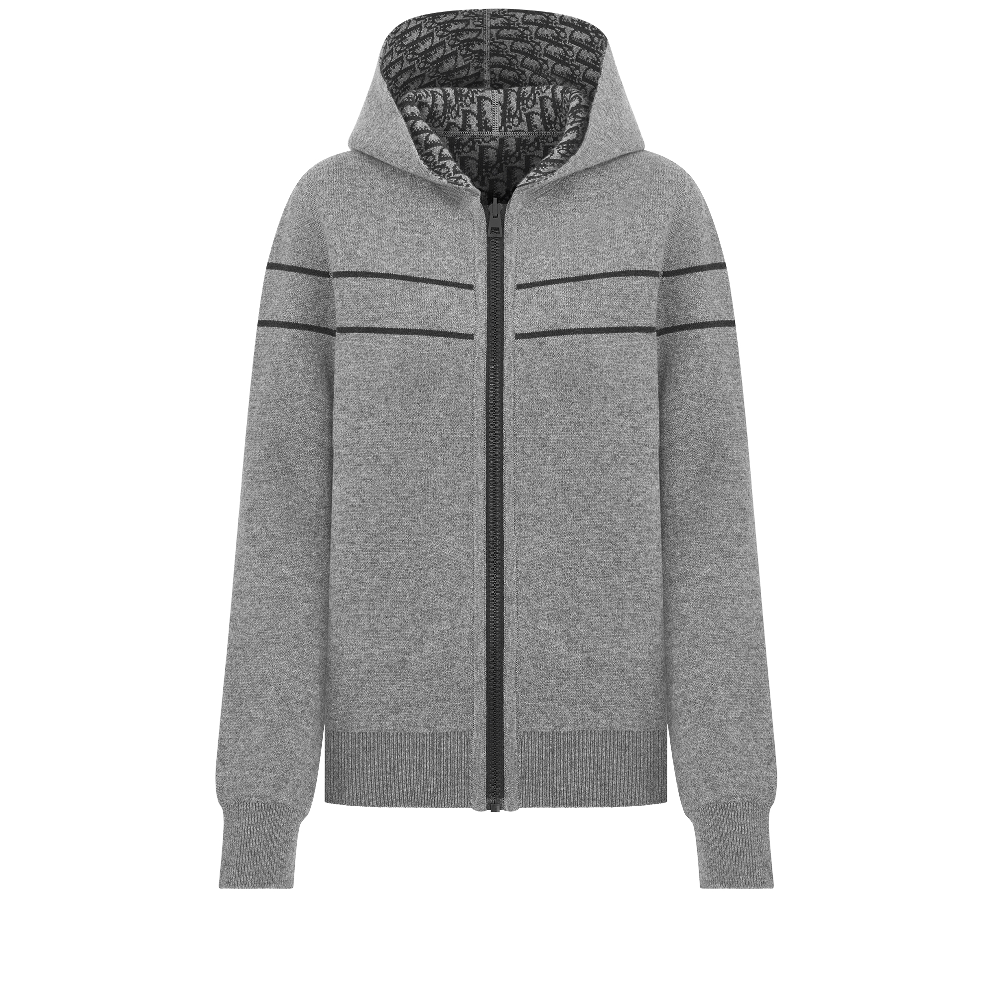 The hooded cardigan reimagines Dior's relaxed elegance. Knit in a cashmere blend, the reversible style features solid gray on one side, with a Christian Dior signature band on the back, and the Dior Oblique motif on the other side. Complete with a hood, the regular-fit zipped cardigan can be styled with the matching pants.