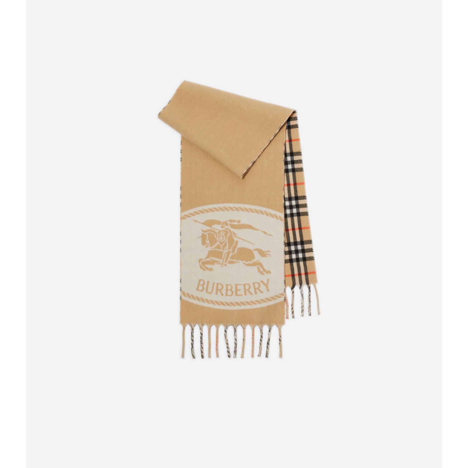 A scarf made in Italy from cashmere, jacquard-woven with our Knight stamp – an archival motif from the 1980s. The design reverses to the Burberry Check and the fabric is washed for an ultra-soft finish and raised nap. Rectangular Fringing at both ends Jacquard-woven Burberry lettering at ends