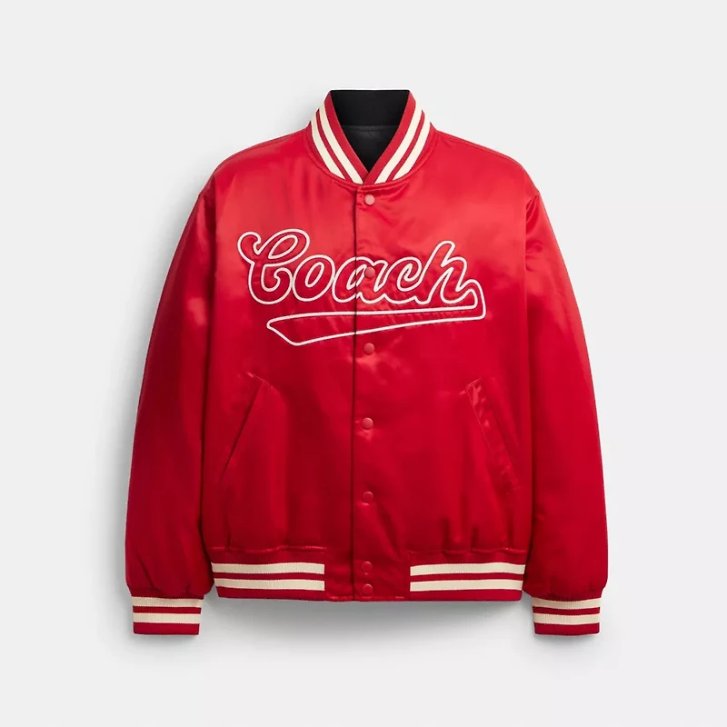 Greetings from NYC! This reversible jacket features two looks in one: one side is printed with the New York skyline, the other is solid with our cursive Coach patch and Varsity Stripe ribbed trim. The vintage sports-inspired design is finished with a snap button closure.The reverse side of this jacket is crafted of 100% recycled polyester––part of our commitment to rethinking and reducing our impact on the planet.