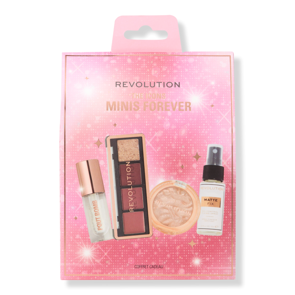 REVOLUTION THE ICONS MINIS FOREVER. Includes: Matte Fixing Spray mini. Pout Bomb mini in Glaze Clear. Icon palette mini. Highlight Reloaded mini. : :