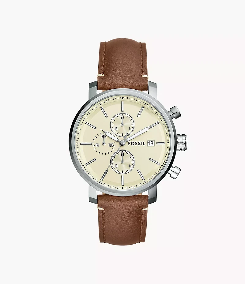 This 42mm Rhett features a cream semi-gloss dial, multifunction movement and brown LiteHide™ leather strap. Fossil leather products support responsible manufacturing via the Leather Working Group.