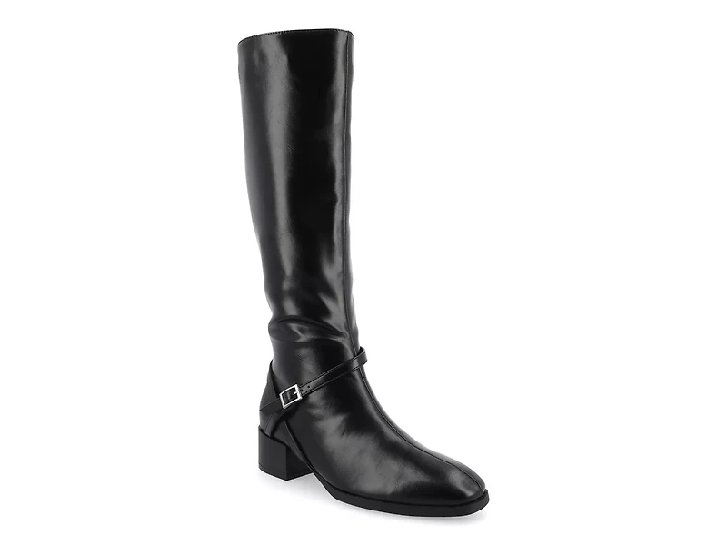 The Rhianah boot from the Journee Collection can offer style and sophistication all day long. A vegan synthetic upper, buckled strap, edgy square toe, and elevated stacked block heel make this zipper boot. A Journee Comfort System™ and memory foam provide daylong comfort.