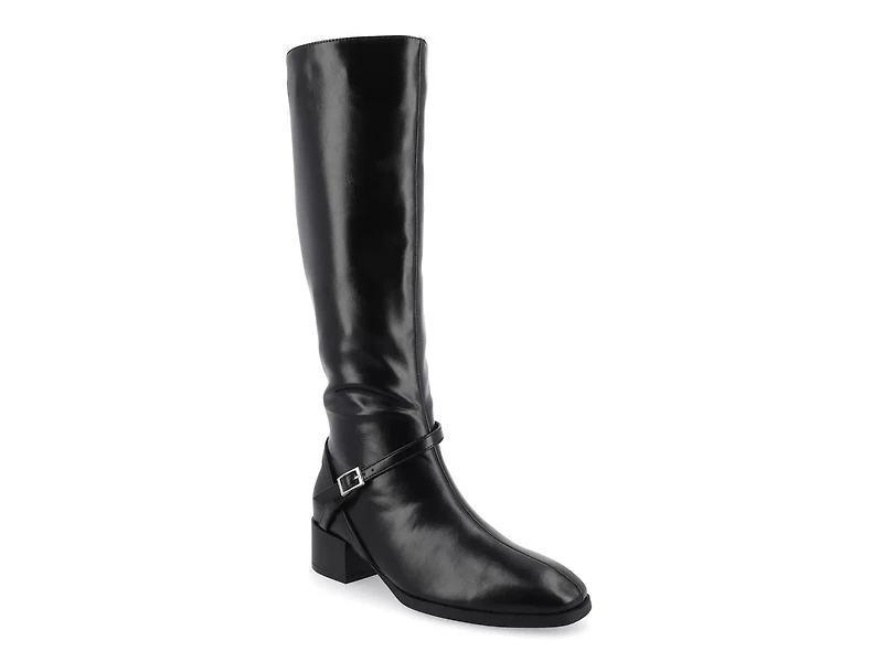 The Rhianah extra wide calf boot from the Journee Collection can offer style and sophistication all day long. A vegan synthetic upper, buckled strap, edgy square toe, and elevated stacked block heel make this zipper boot. A Journee Comfort System™ and memory foam provide daylong comfort. This boot is available in wide-width footbed and extra-wide calf option to provide a spacious fit.