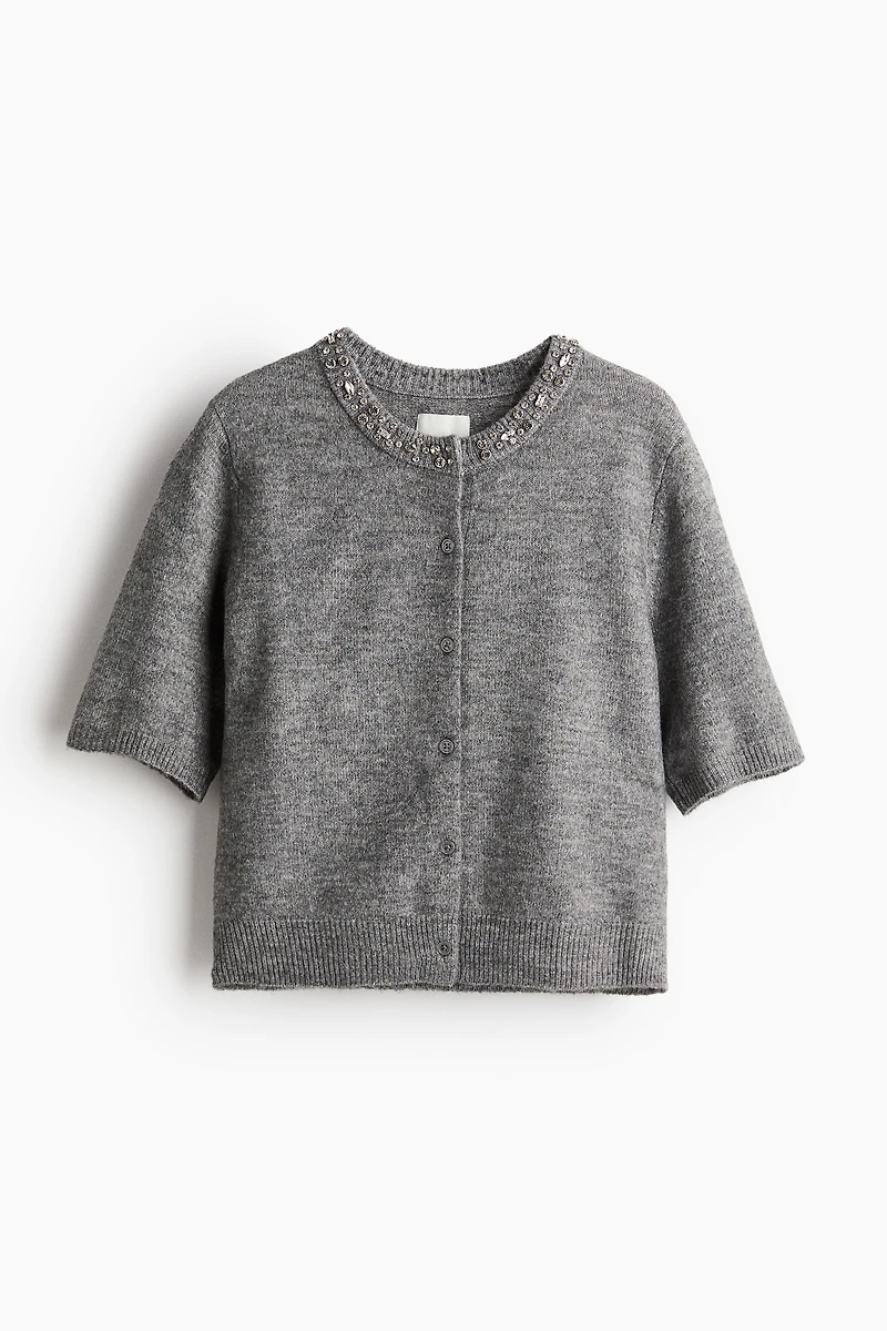 Short, soft, knit cardigan. Round, rhinestone-embellished neckline, buttons at front, and short sleeves. Ribbing at neckline, cuffs, and hem.