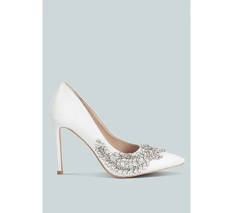 The pumps with high-heeled stilettos are sublime with elegance in their classic style and rhinestone embellishment. The pumps are all about opulence and a classy affair and would look lovely paired with a cocktail dress for a fancy event! They would also make great bridal shoes for this season.Upper Material: SatinOuter sole: ResinClosed Pointed ToeRhinestones EmbellishmentHigh Heel StilettosPull TabsLightly Cushioned InsolesSH4237
