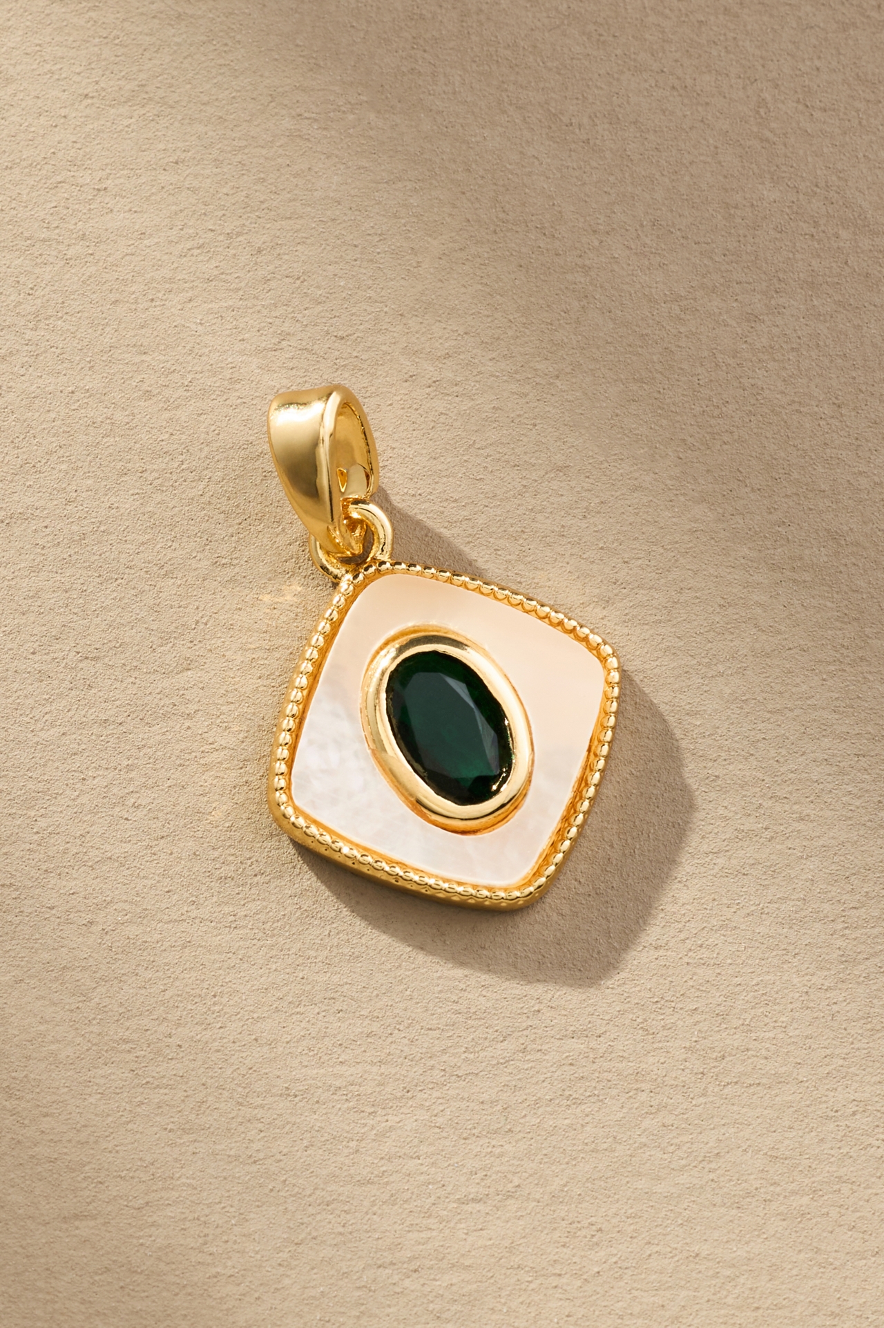 ***Charming* new-trend alert: jewelry for your jewelry,** featuring a green gem on a rhombus-shaped charm.