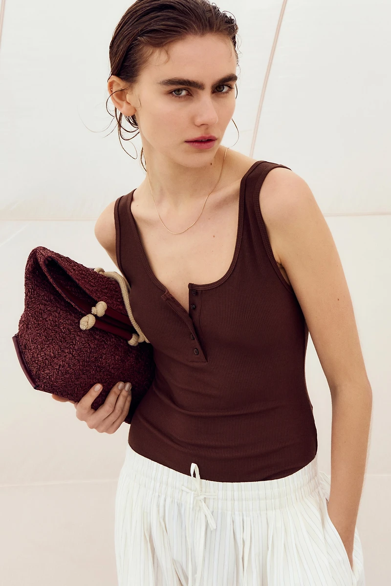 Sleeveless bodysuit in ribbed jersey. Scoop neck, short button placket at front, and concealed snap fasteners at gusset. Narrow binding at neckline and armholes.