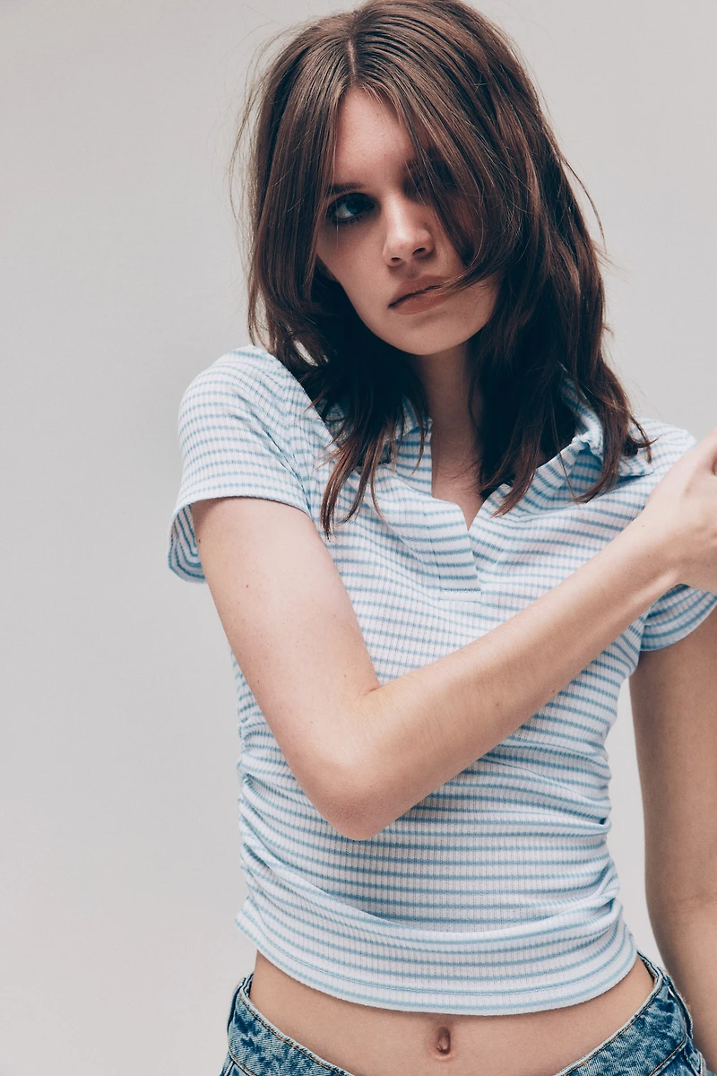 Short-sleeved top in ribbed jersey. Open collar and gathers at sides of waist.