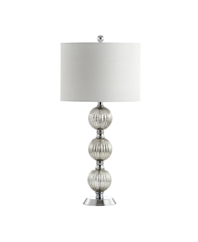 This Hollywood Regency-inspired lamp adds low-key glamour to your bedroom or living room; or use two on a dining room console. The silvered glass orbs and drum shade have mid-century modern flair, finished with upscale touches like the crystal finial and silk-wrapped cord. Includes an Led bulb.