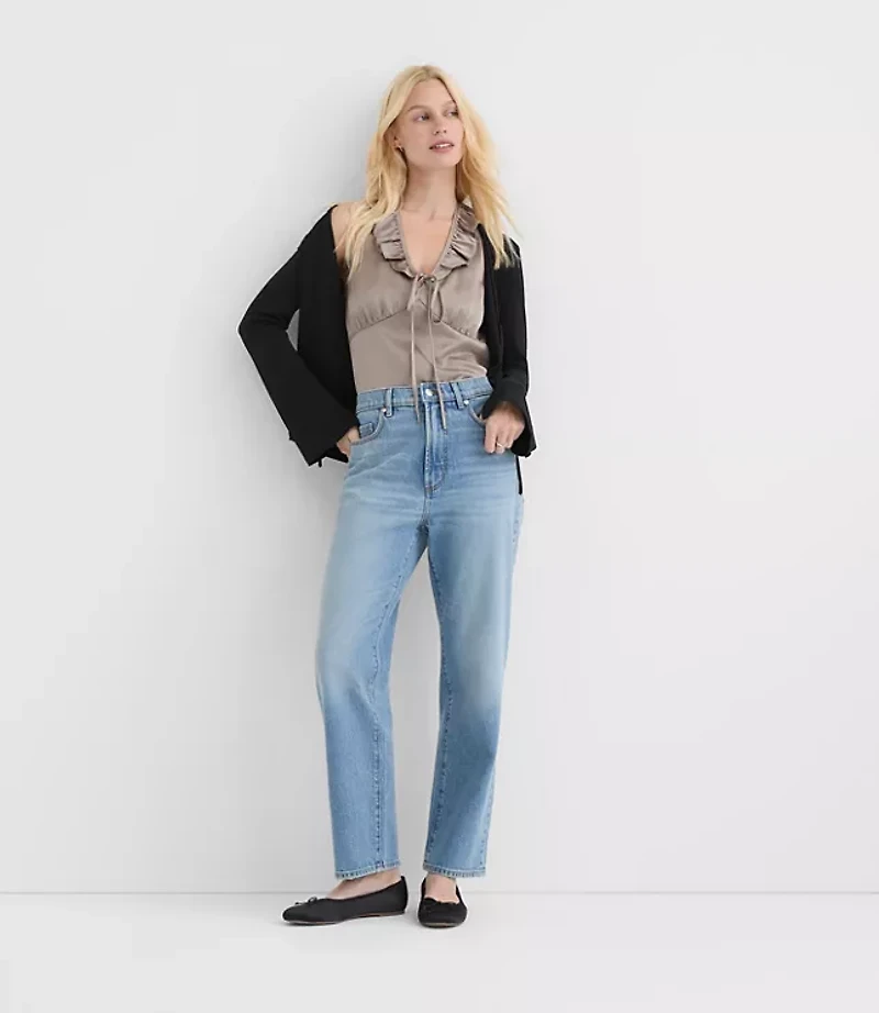 Meet our new, even better denim brand, Rivete. We believe jeans are a way of life, so we designed using higher quality, premium denim incorporating thoughtful details, like a longer fly for extra ease and comfort, perfectly - sized pockets for a more flattering shape, and durable elements such as reinforced stitching. Each style is created to be a forever favorite to build endless outfits around. Start here, Bullet1: Designed with Comfort Stretch: our mid stretch denim, Pants Details: Front zip with button closure. Belt loops Five pocket styling., Leg Shape: Straight - fitted through the hip and thigh, opening up at the knee for a perfect straight leg, Rise: 12 1/2"high rise, sits at natural waist, Imported:, Fit: Our short jeans are designed to perfectly fit and flatter shorter legs, with an average 2"shorter inseam, Length: Ankle length, 26 3/4"inseam, Fabrication: 76% Cotton 23 Lyocell 1 Spandex, Garment Care: Machine Washable Loft Rivete Short High Rise Straight Jeans in Aura Wash Size 24 Women's by Loft Size Regular - 24 Light Wash Women's Regular, Light Straight Pants 76% Cotton 23% Lyocell 1% Spandex Machine Washable