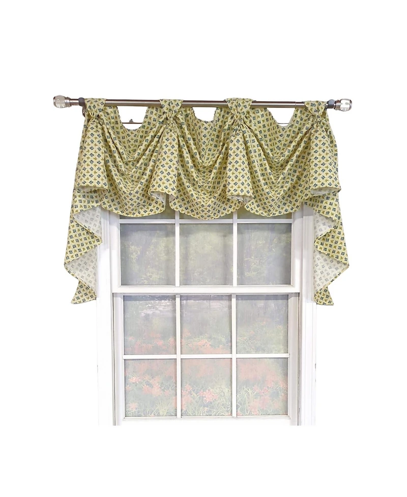 Add a playful touch to your interiors with the Rlf Home Little Treasure 3-s Victory Swag in a sunny Yellow shade, designed to enhance both traditional and casual decor. Made from 100% cotton, this unlined swag features a unique three-scoop victory design that adds soft folds and dimension. Measuring 54" wide x 25" length, it fits windows up to 54 inches wide and can be layered with multiples for wider coverage. The breathable cotton fabric allows natural light to filter gently, creating a warm and inviting atmosphere. With a convenient tab top, this swag installs easily on tension rods or decorative poles up to 2 inches in diameter, combining style and functionality for everyday use.