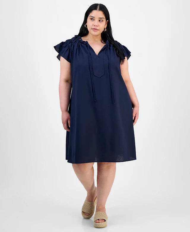 Robbie Bee Plus Size Flutter-Sleeve Tie-Neck Shift Dress