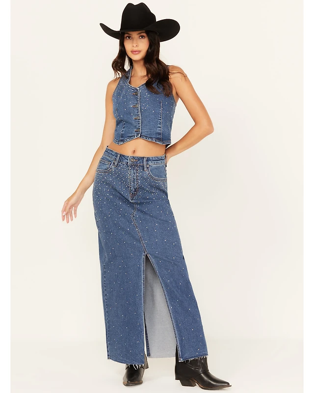 Rock & Roll Denim Women's Medium Wash Rhinestone Studded Maxi Skirt