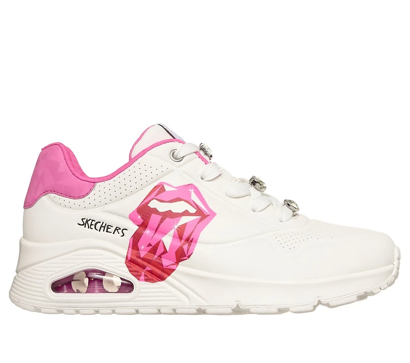 Rock 'n' Roll's most iconic logo takes center stage in this exciting collaboration! Get ready to rock out in style and comfort wearing Skechers Street™ x Rolling Stones: UNO - Diamond Stones. Inspired by the Hackney Diamonds album, this fashion lace-up features the Rolling Stones' 'Lick' logo graphic on a durabuck upper with perforated details and rhinestone lace charms. The design is complete with a cushioned Skechers Air-Cooled Memory Foam® insole and a visible Skech-Air® airbag midsole.