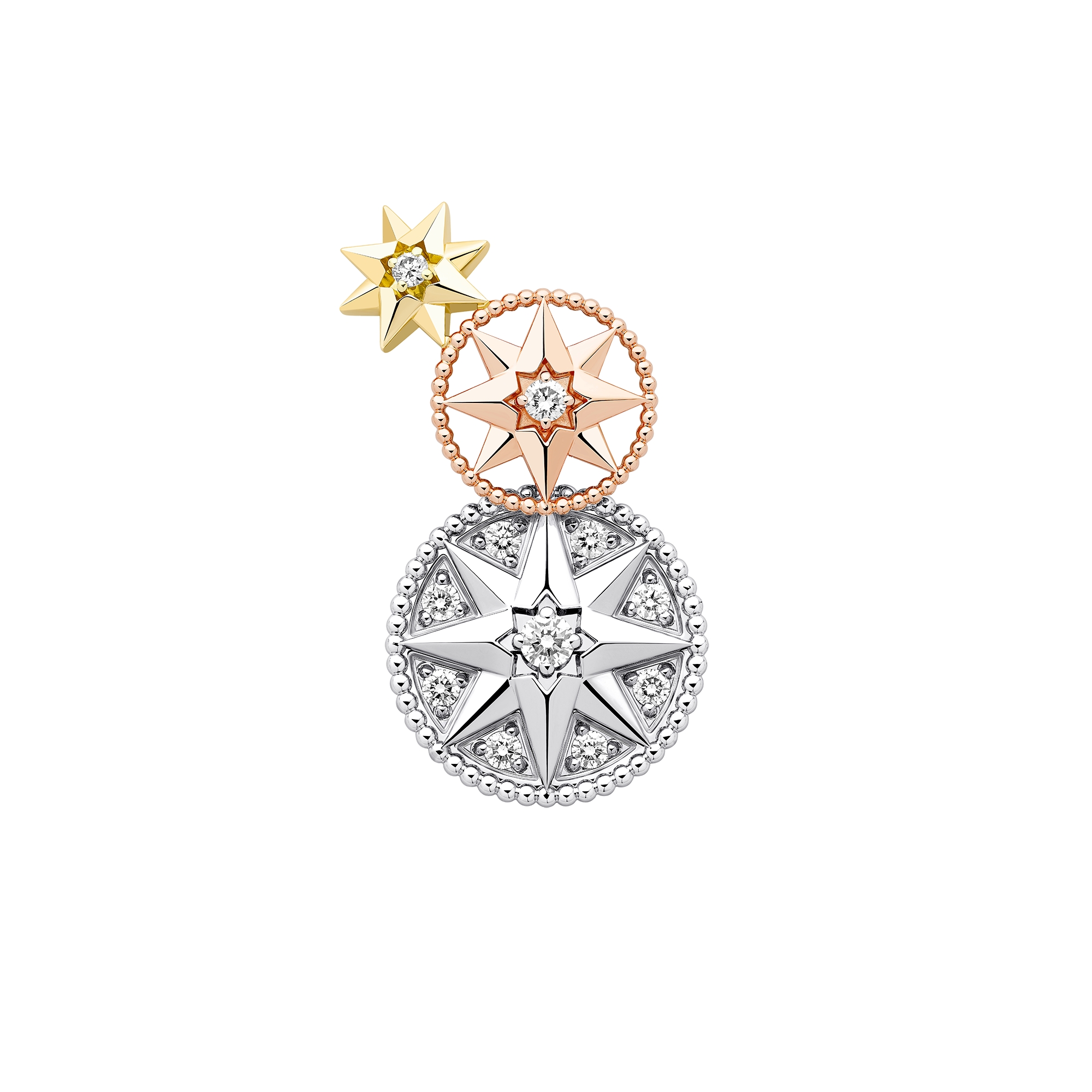 Étoile des Vents opens a refined new chapter for the collection with a reinterpretation of the iconic Rose des Vents motif without its gemstones and incorporating Mr. Dior's symbolic lucky wind rose star. The Tribale earring is composed of three motifs combining yellow, pink and white gold in a subtle balance. Worn alone or with the reversible pendant displaying the wind rose or diamond pavé side, the Victoire de Castellane creation inspires unique styling options for every wearer.