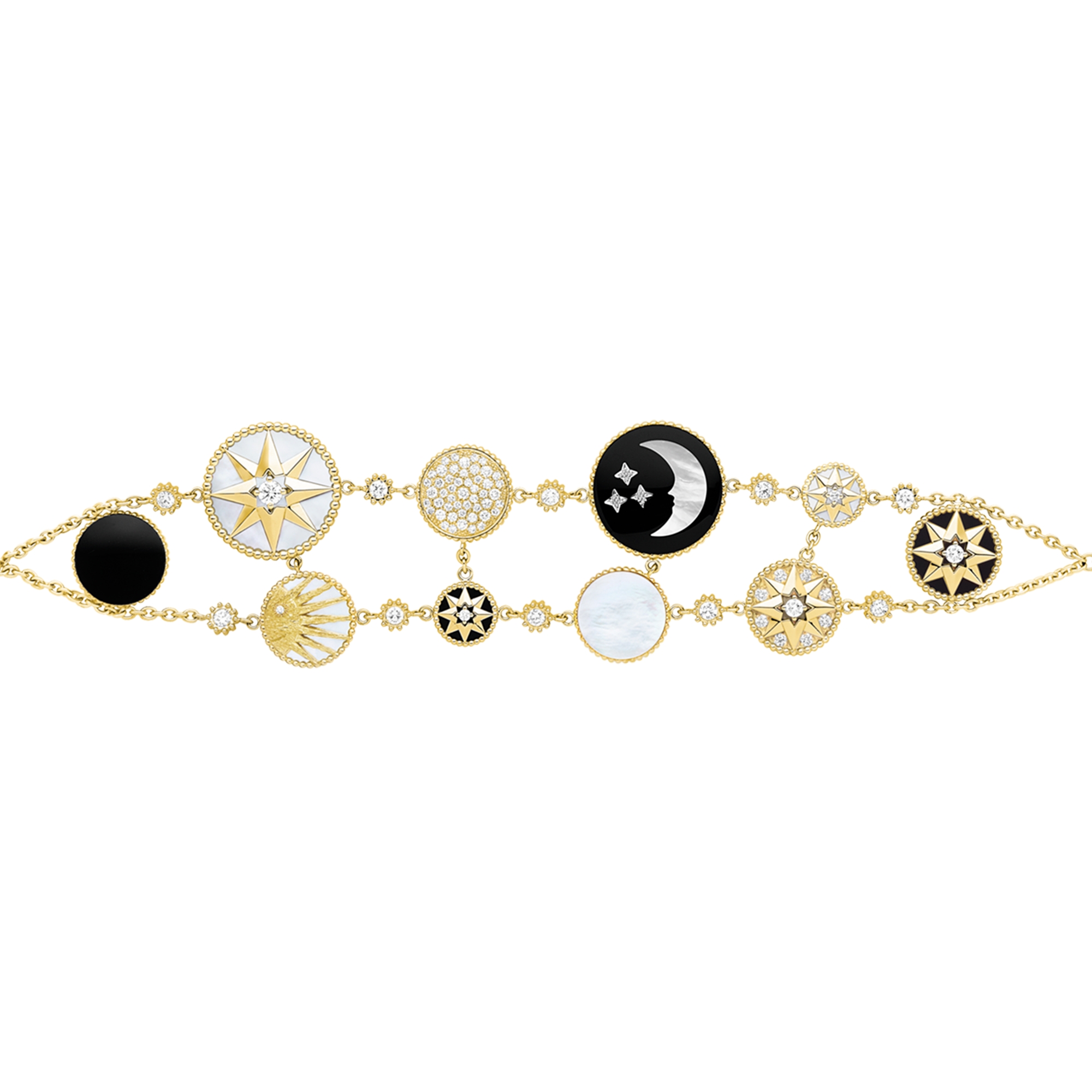 Victoire de Castellane combines Rose des Vents, Rose Céleste and Mimirose in a new range of sophisticated creations. A ring of beading encircles the motifs, which turn to switch between the Rose Céleste or Rose des Vents side and the gemstone side.