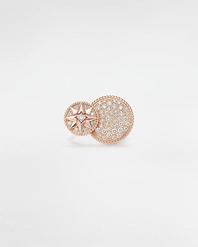 The Rose des Vents creations, inspired by the Villa Les Rhumbs garden mosaic in Granville, showcase colorful ornamental stones and precious diamonds, embodying the essence of Dior fine jewelry. The exquisite ring blends the iconic Rose des Vents design with the radiance of pink gold, enhancing the brilliance and purity of the diamonds. The artisanal snow setting technique accentuates their sparkle, capturing the shimmer of sunlit snow. Timeless and elegant, the piece can be effortlessly paired with other treasures from the Rose des Vents collection. 18K pink gold. Diamonds (0.97 ct*). Motif diameters: 12 and 17 mm / 0.5 and 0.7 inch