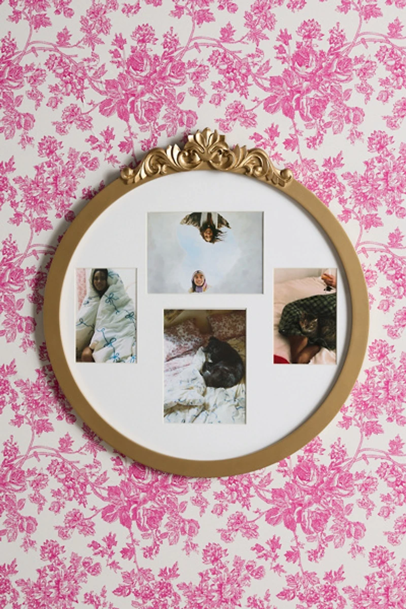 Celebrate your favorite memories with this circle picture frame topped with filigree-inspired accents for an ornate, vintage feel. This picture frame offers space to display four pictures.