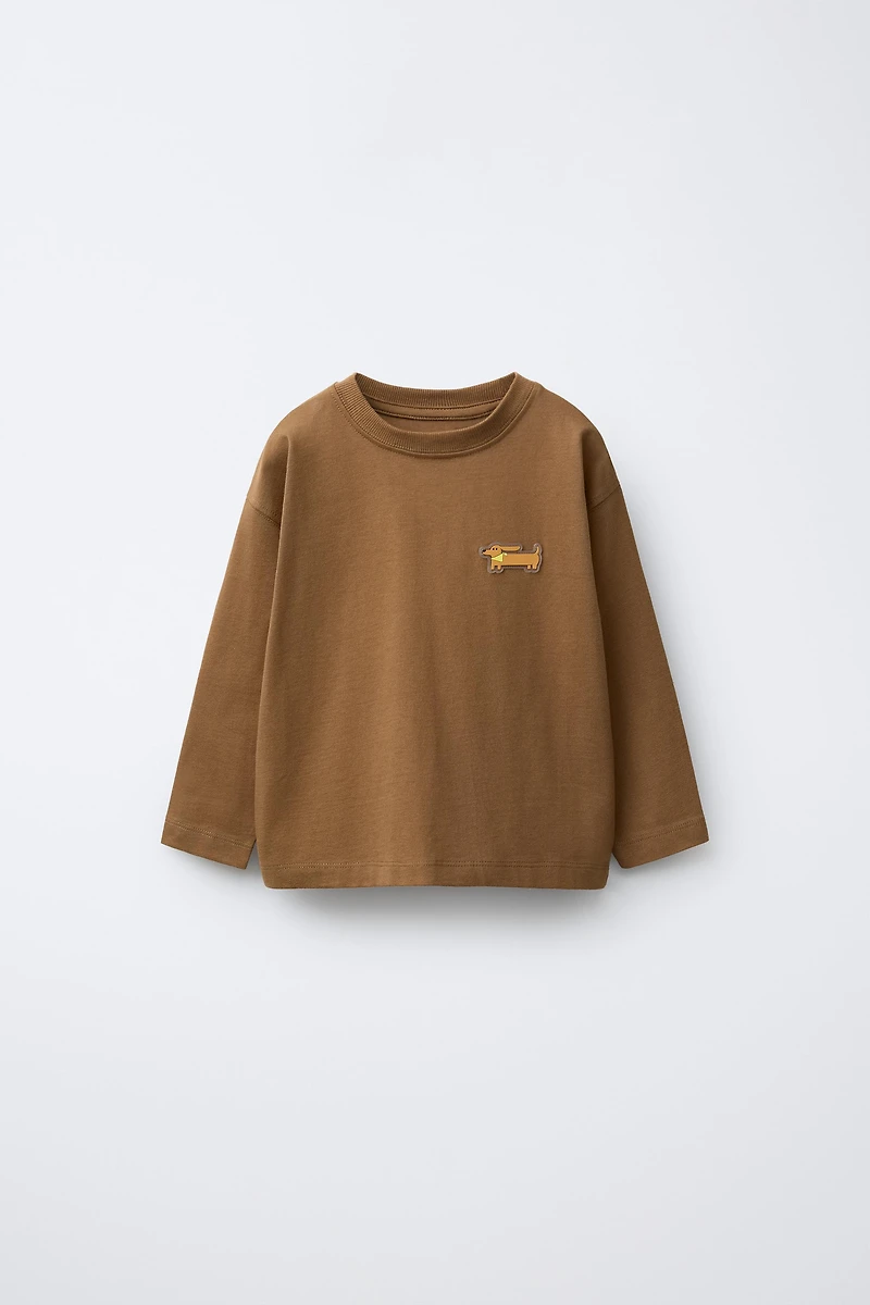 Round neck, long sleeve T-shirt. Rubberized animal appliqué on the chest. 100% cotton fabric.
