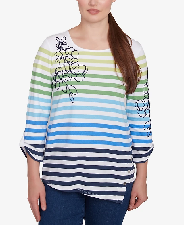 Ruby Rd. Petite Multi Stripe Roll Tab Sleeve T Shirt