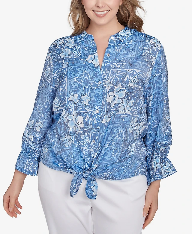 Ruby Rd. Plus Size Silky Floral Tile Button Tie Front Top