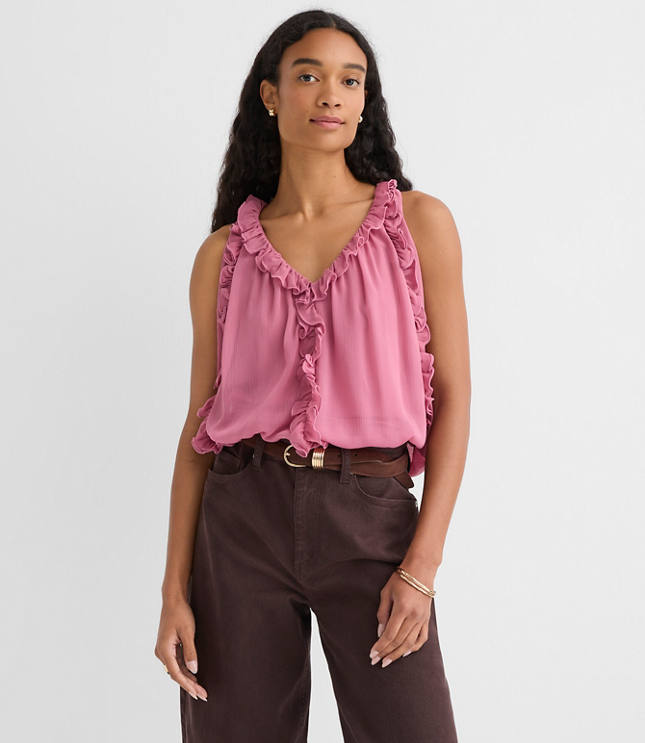Ruffles crown this fluid and flattering chiffon shell with just the right pop of pretty. V - neck. Sleeveless Lined, Bullet1: 23 1/2"long, Imported:, Fit: Relaxed an easy shape that's just shy of loose, Length: Regular - hits below natural waist, Fabrication: 100% Polyester, Garment Care: Machine Washable Loft Ruffle V - Neck Shell Top Size 2XS Precious Rose Women's by Loft Size Regular - 2XS Precious Rose Women's Scoop, Neck Sleeveless Blouse Tops Wear To Work 100% Polyester Machine Washable