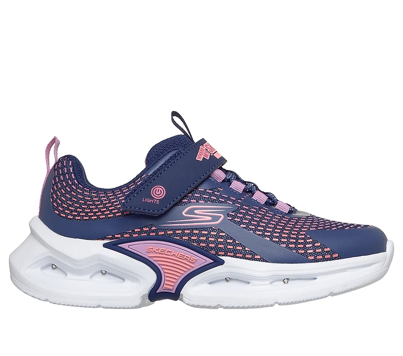 Stay connected to comfort in light-up fun with Skechers S-Lights®: Kinetic-Lights - Where's My™ Skechers®? Designed with a hidden locator tag compartment under the heel of the insole, this light-up Skechers adaptive closure style features a mesh and synthetic upper with fixed stretch laces, an adjustable instep strap, and a shock-absorbing sculpted midsole with branding detail.