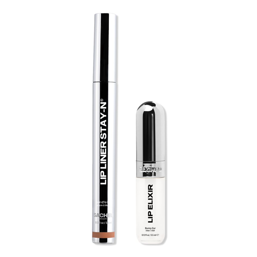 LINE & SHINE BUNDLE. Benefits: Stays in place all day & night. High-Shine, Non-Sticky. Key Ingredients: Hyaluronic Acid - helps provide instant and lasting hydration. Vitamin E - provides antioxidant-rich nourishment. Includes: Peel Off Lip Liner STAY-N (0.12 oz). Lip Glaze Elixir - Bunny Ear (0.12 oz).