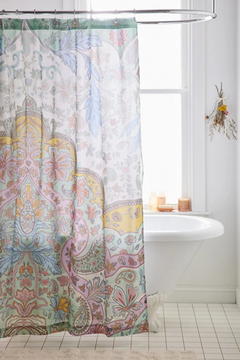 Bring a vibrant layer to your bathroom décor with this cotton shower curtain featuring bandana-inspired florals printed allover the front panel. Complete with 12 buttonholes along the upper edge for easy setup. Available exclusively at Urban Outfitters.