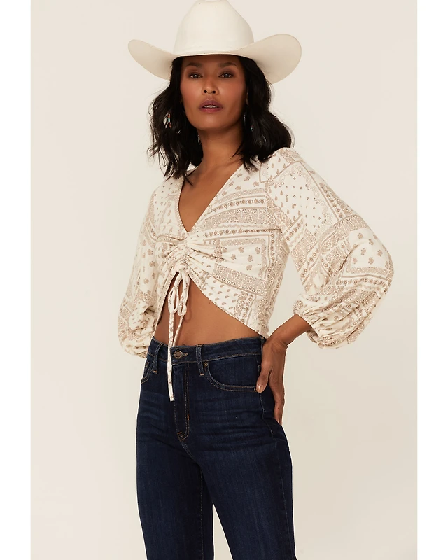 Petite Bandana Print Split Neck Balloon Sleeve Blouse
