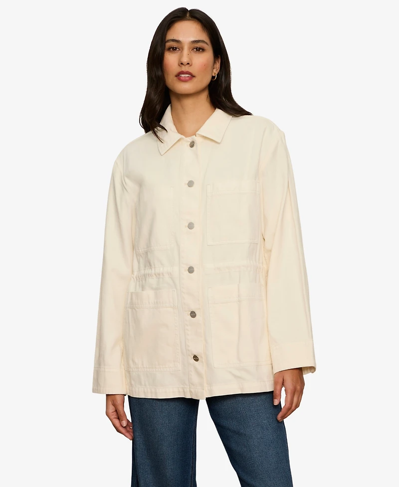 Shacket styling with a spread collar and hidden drawcord defines this Sanctuary layer. Button-front closure and multiple pockets offer versatile utility.