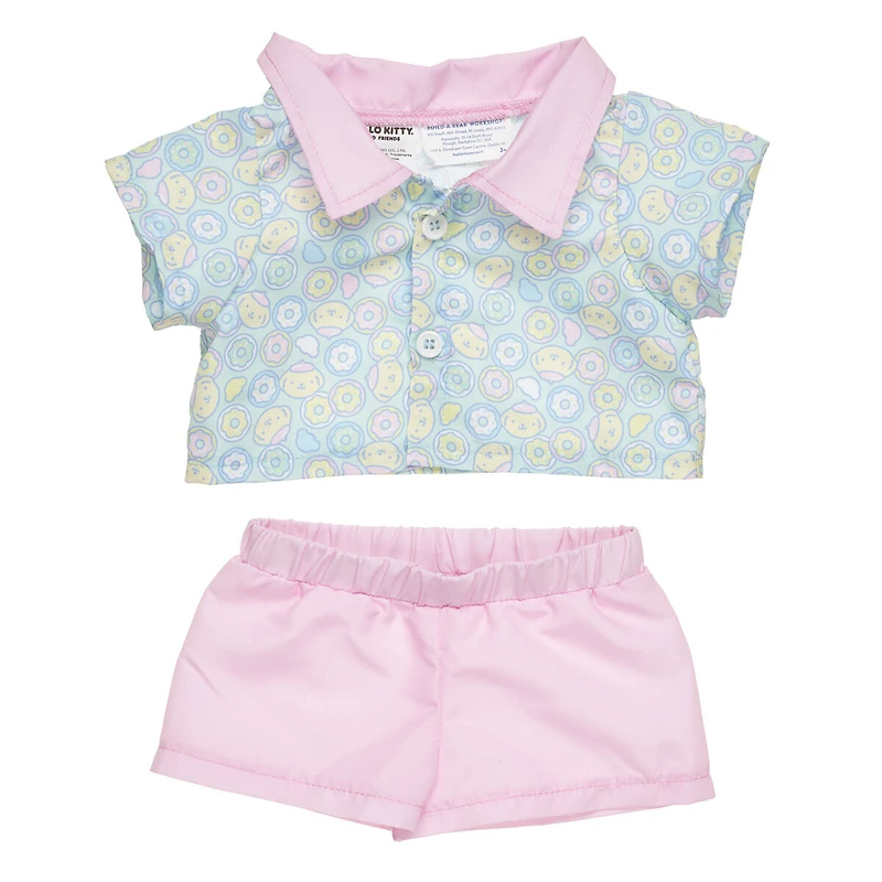 This two-piece Pompompurin™ plush outfit includes a button-up shirt and matching pink pants. The colorful collared shirt features a pastel donut pattern with Pompompurin™ sprinkled throughout!