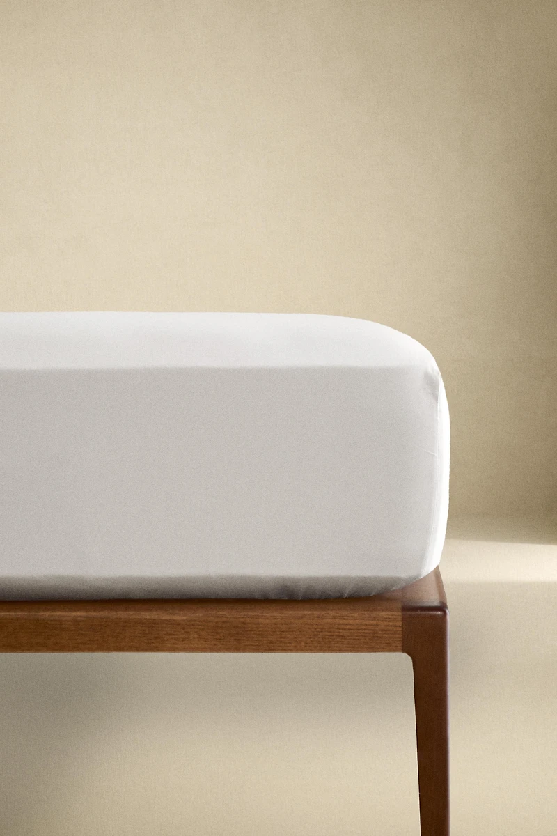Plain adjustable fitted sheet in 300-thread-count sateen, for a 11.8" thick mattress.