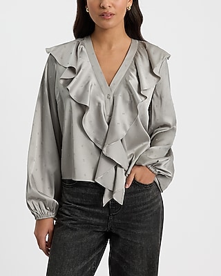 Satin Clip Dot V-Neck Long Sleeve Button Front Ruffle Top in Bloomington, MN