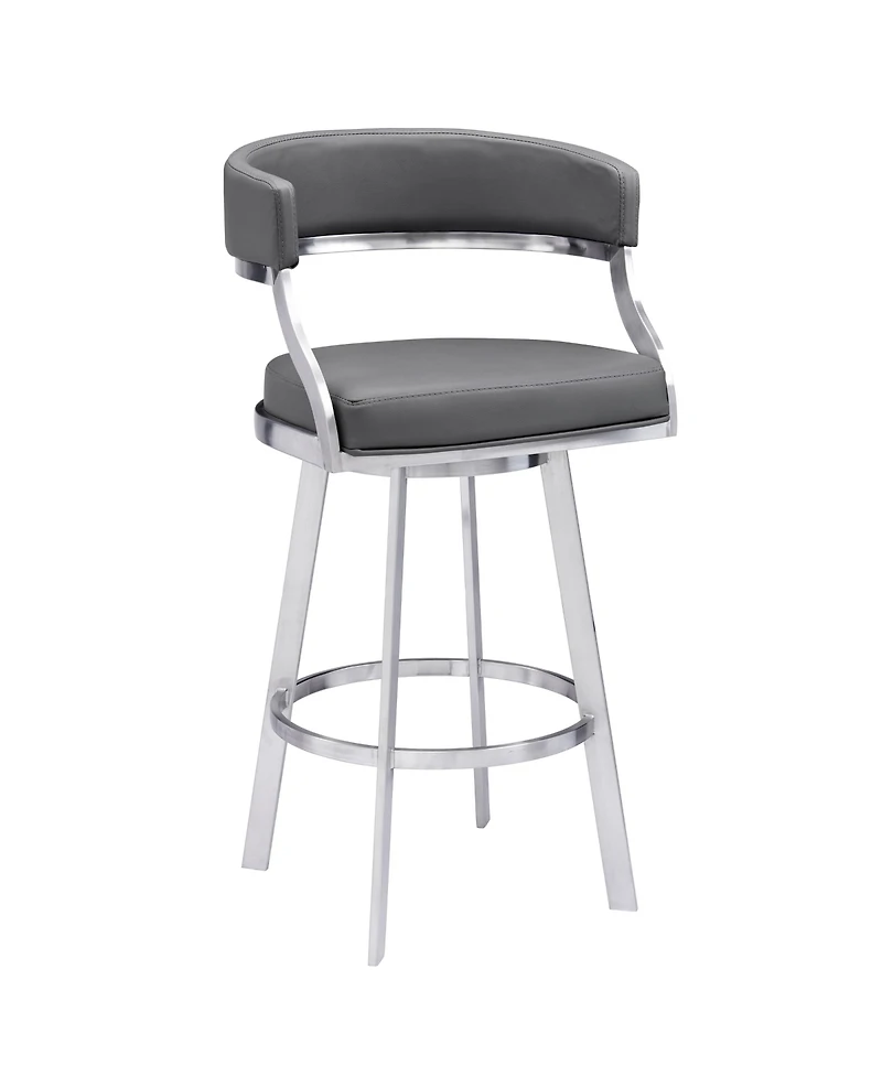 The Saturn 30"" Bar Height Swivel Gray Artificial leather and Brushed Stainless Steel Bar Stool from Armen Living is a unique addition to any home or apartment. The Saturn's soft Artificial leather upholstery is wrapped around a high-density cushion that cover the back and seat of the kitchen stool, providing you with optimal comfort. The 360-degree swivel motion allows your guests to stay engaged at parties or gatherings regardless of their place in the room, making this the perfect stool for entertaining! The Saturn is ideal for any room in your house, such as your kitchen, office, home bar, or den due to the availability of 2 seat height options. The open seat back provides breathable seating and allows for easy movement around your home. The sturdy frame consists of a 4 leg-base that includes a ring footrest and floor protectors, ensuring the Saturn will not damage your floors, further accentuating its convenience. The Saturn Bar or Counter Stool is available in a brushed stainless-steel finish with gray or black Artificial leather, an auburn bay metal finish with brown Artificial leather, or a mineral metal finish with vintage black Artificial leather upholstery.