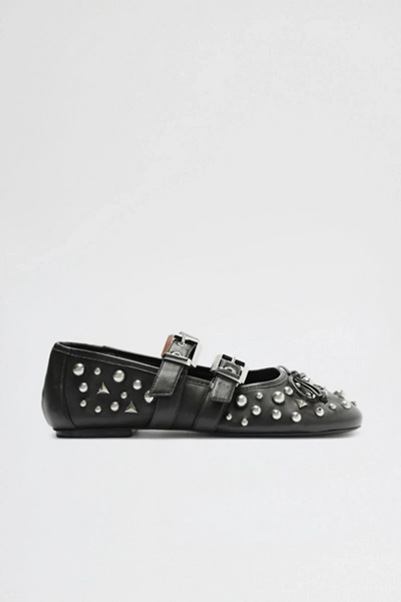 Incorporate some edge into your ballet core ensemble this season with our new Sarita flats. Crafted from buttery Nappa leather and featuring a bow, two thick buckles, and studs throughout, these flats are sure to pair well with all-black catsuits, tulle skirts, and other wardrobe pieces.
