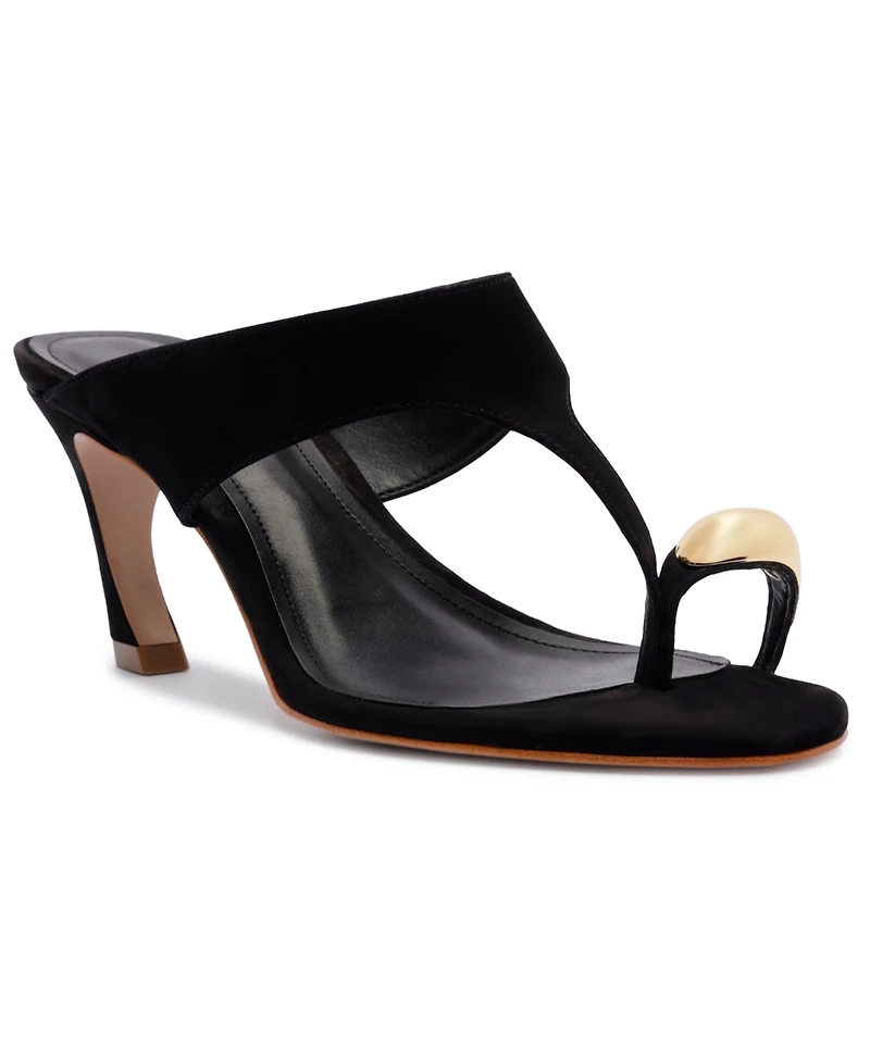 Crafted with clean, unbuckled lines, the Maisie sandal features a sleek mid stiletto heel for just the right lift. Its thong entry and thick upper strap create a modern silhouette, accented by a subtle gold toe detail that adds a touch of shine. Perfect for elevating evening looks or adding polish to your favorite summer outfit.