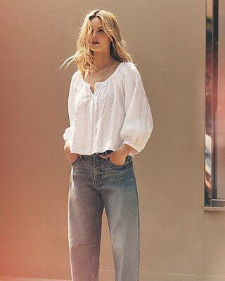 A balloon sleeve top with a comfortable lightweight cotton material, a scoop neck and button front.