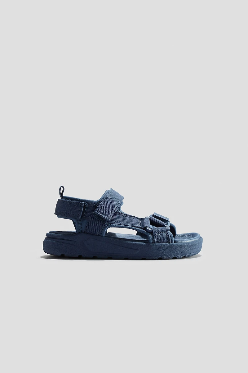 Sandals in soft scuba fabric. Adjustable foot and ankle straps with hook-loop fastening. Molded insoles and fluted soles.