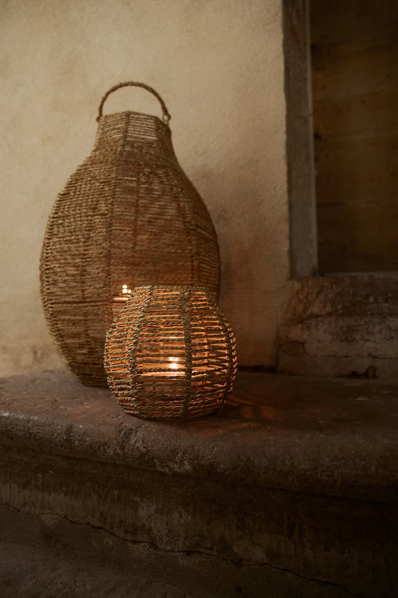 Tea light holder with a rigid, seagrass-wrapped metal frame and a glass chimney to keep candle in place.