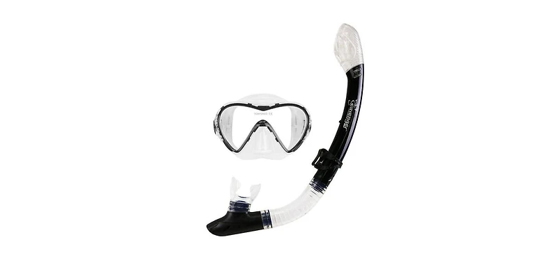 Endless exploThe Seavenger Aviator Mask and Snorkel Set is perfect for exploring underwater in places like Hawaii or the Florida Keys. It features a wide tempered glass lens for a clear panoramic view, a split-strap design to reduce eye pressure, and adjustable buckles for a custom fit. The snorkel includes dry-top technology and a float valve to seal underwater, plus a one-way purge valve, hypoallergenic mouthpiece, and flexible tube for easy breathing and comfort.ration is at your fingertips with the Seavenger Aviator Mask and Snorkel Set. This 2-piece combo of essential gear features a dry-top snorkel for easy breathing and a tempered glass single-lens mask that ensures a vivid, crystal-clear underwater view.