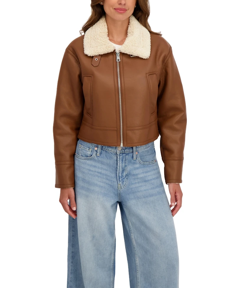 Tough meets cozy in this cropped faux leather jacket from Sebby Collection, designed with a plush faux shearling interior that s bonded for warmth and comfort. The moto-inspired silhouette features a soft faux shearling collar and a ribbed back hem that adds subtle shape and ease of movement. A zip-front closure creates a clean, modern finish, while the cropped length pairs perfectly with high-rise jeans or trousers. Side-entry pockets blend seamlessly into the sleek lines of the jacket. With its edgy look and plush feel, this faux shearling coat delivers statement style for cooler days.