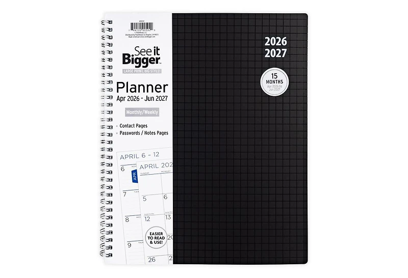 The See it Bigger 15-months dated planner with large, easy-to-read print. It has plenty of room to jot down all of your notes and tasks. Individual monthly tabs allow for quick access to separate monthly calendars that open flat in side-by-side pages for simple retrieval. A defined space along the right margin provides additional room for notes and tasks. Each monthly tab includes dated weekly pages that open, so each week may be viewed in its entirety.