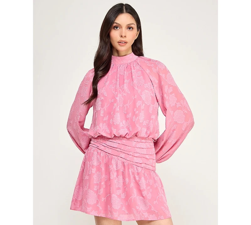 A mock neck and raglan long sleeves complement the blouson bodice of this sophisticated Seni & Cade dress. An asymmetric shirred waistband and short skirt create modern appeal.