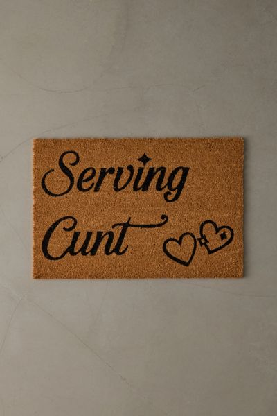 You’ll be serving with this coir welcome mat. This durable doormat features Serving C\*\*\* text paired with little hearts. Available exclusively at Urban Outfitters.