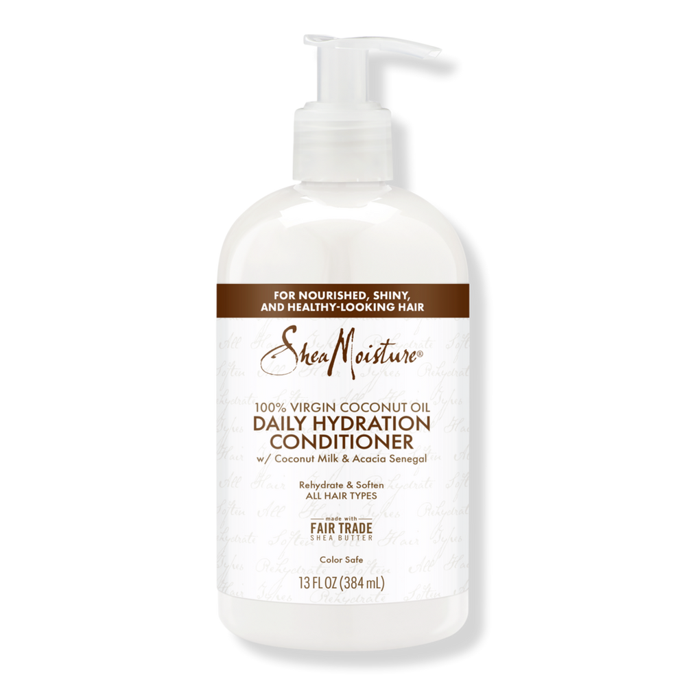 VIRGIN COCONUT OIL COND 13.0OZ. Benefits: SheaMoisture Virgin Coconut Oil Conditioner is a rinse-out conditioner that helps hair achieve moisture balance, allowing hair to be nourished, shiny, and healthy-looking.. This daily hydration conditioner for all hair types helps hair become softer and smoother and reduces tangles.. This conditioner, infused with 100% coconut oil, helps enhance natural softness and reduces frizz.. When used together, the 100% Virgin Coconut Oil Shampoo & Conditioner provide 5x more moisture. *vs non-conditioning shampoo. Wrap your hair in a light coastal coconut breeze and style with ease.. All SheaMoisture hair products, like this 100% virgin coconut oil for all hair types, are made with Fair Trade Shea Butter and contain no silicones, no sulfates, no parabens, no phthalates, no mineral oil and no petrolatum.. : :