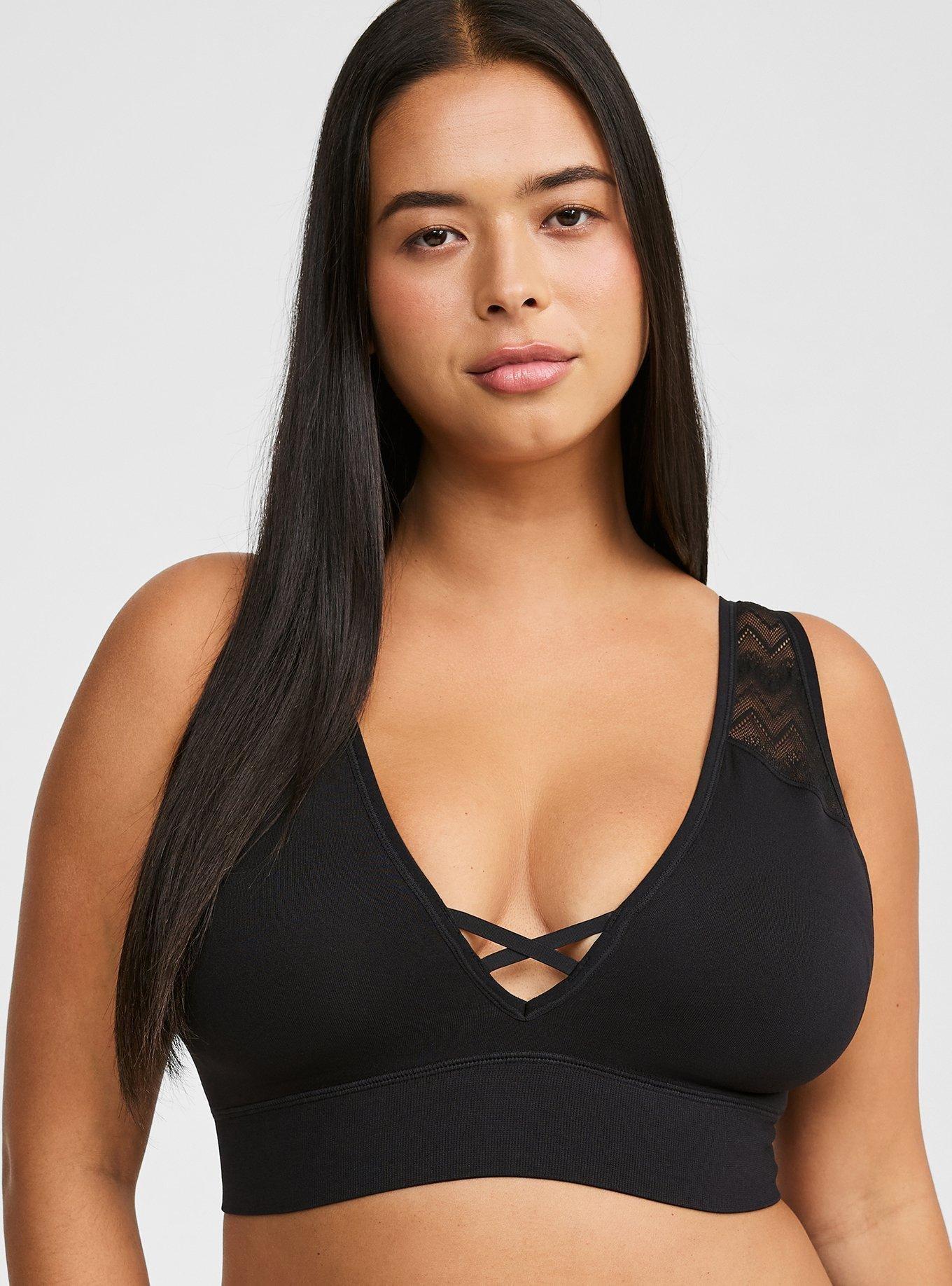 FIT Bralette silhouette. Lightly lined. Seamless Wireless. MATERIAL + CARE Cotton-spandex blend fabric. Machine wash cold. Tumble dry low. Imported. DETAILS Plunge neckline. Sheer lace paneling. XO front detail. Adjustable straps.