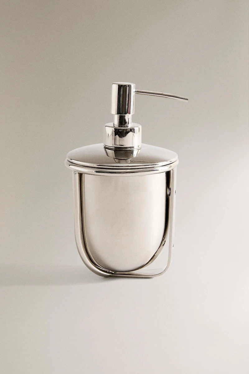 Soap dispenser made of stainless steel with a shiny finish and contemporary curved design. It can be wall-mounted. Includes mounting hardware.